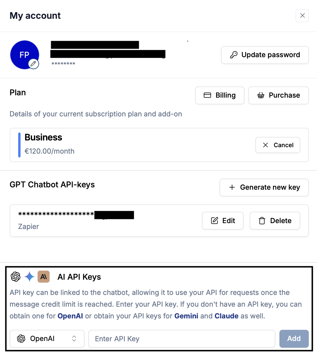 To set up your own API key, you will first need to register on the AI provider’s website. GPT Chatbot currently supports large language models (LLMs) from OpenAI, Anthropic, and Google. In the future, we plan to expand our list of supported models, potentially incorporating open-source and fine-tuned ones.Provider-specific instructions
